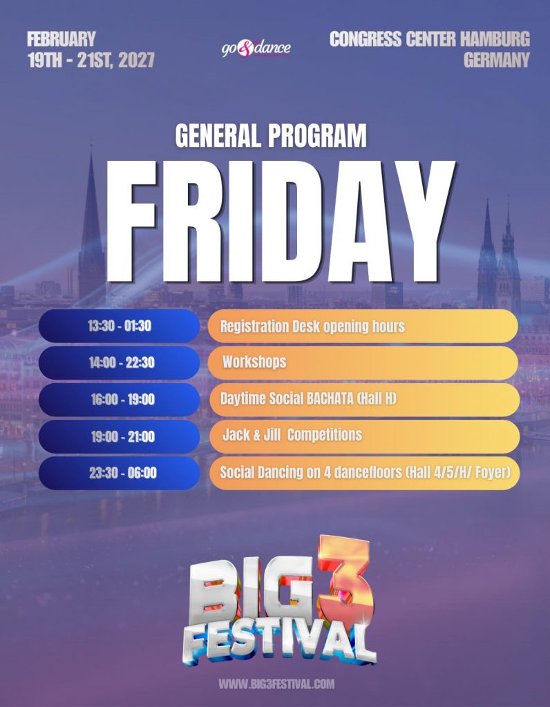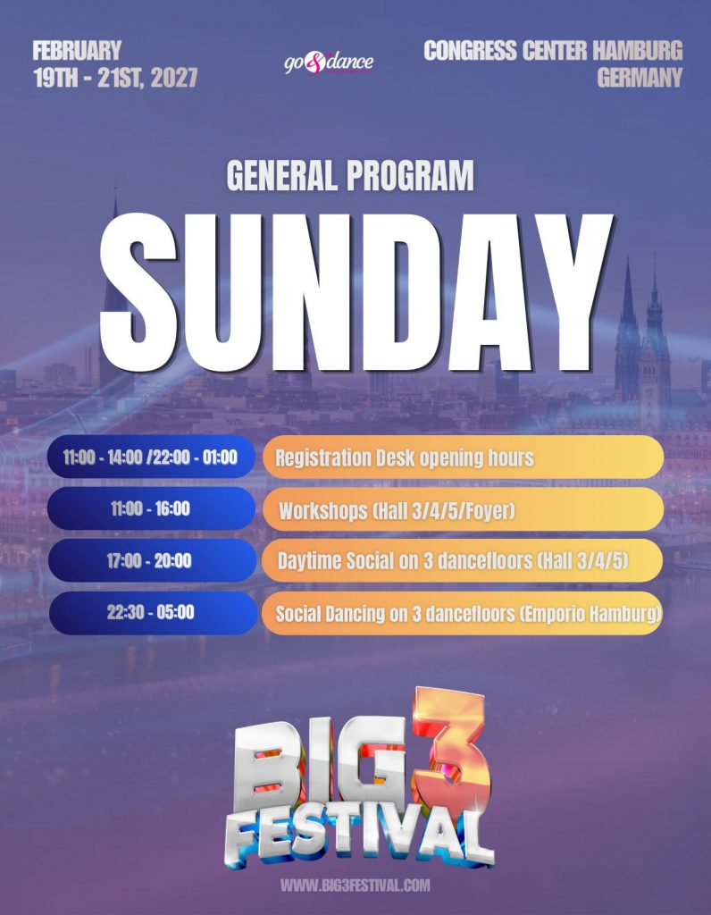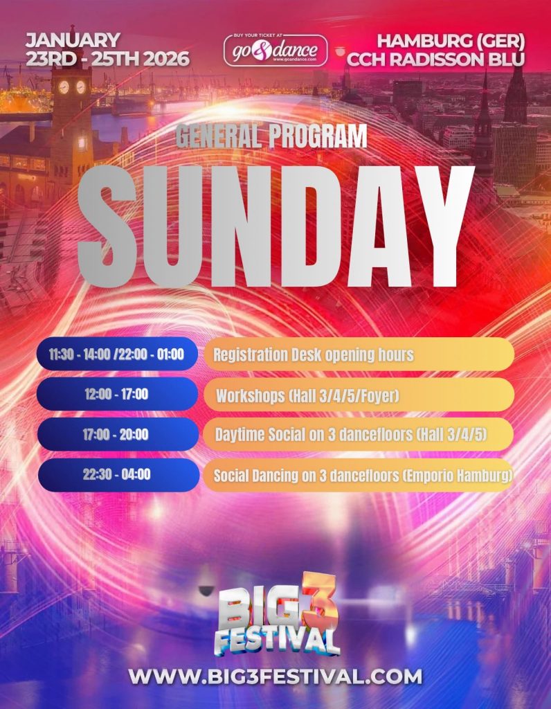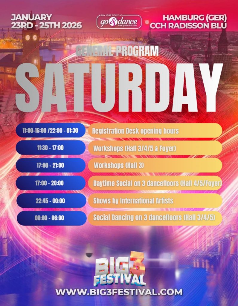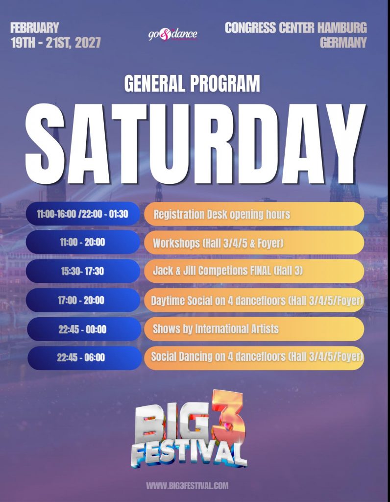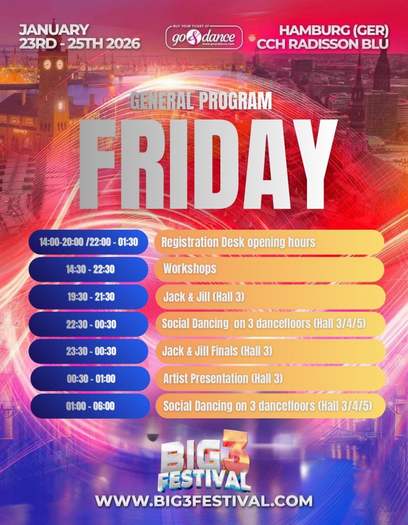 The program offers three dance floors for day and night socials, featuring over 50 world-renowned artists, more than 50 hours of workshops with international artists, spectacular shows, over 30 hours of social dancing, and an exciting Jack & Jill competition.